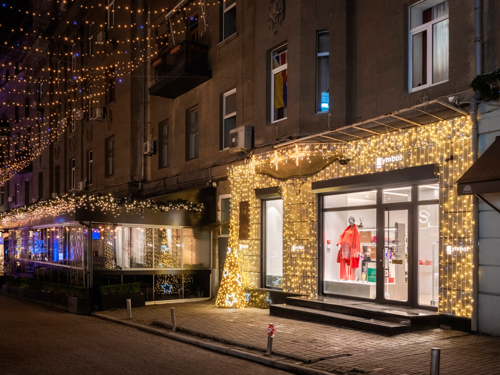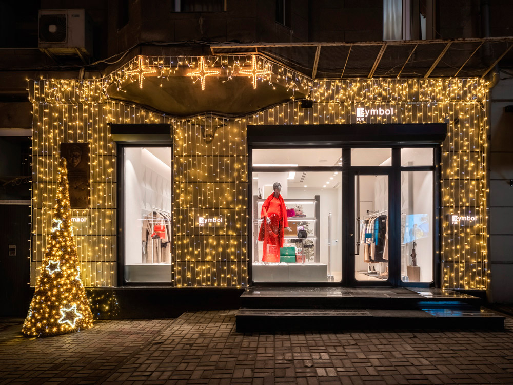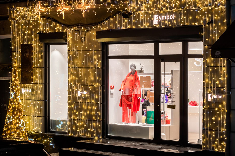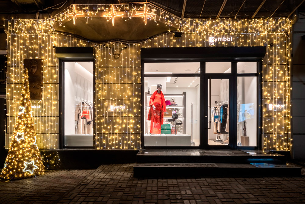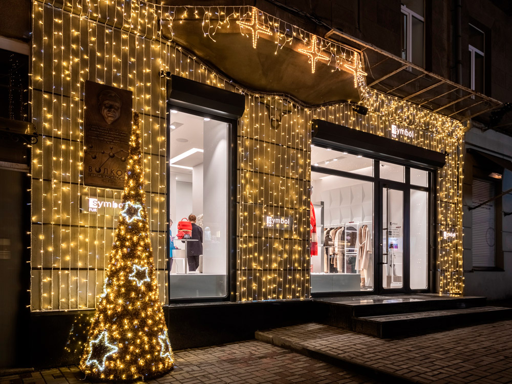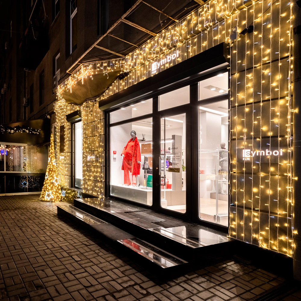 Новогоднее оформление фасада магазина Symbol FUR придало зданию праздничный шарм и неповторимый вид. Такая праздничная иллюминация привлекает как покупателей, так и прохожих, оставляя приятное впечатление и создавая атмосферу Рождественских праздников.
