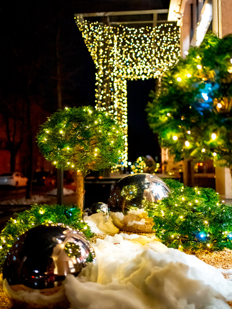 Гармоничный и классический вид продолжается и на деревьях и кустах рядом с фасадом, также украшенных световыми гирляндами String Lite. Использование гирлянд с мерцанием придает изысканность и создает впечатление праздничного блеска.