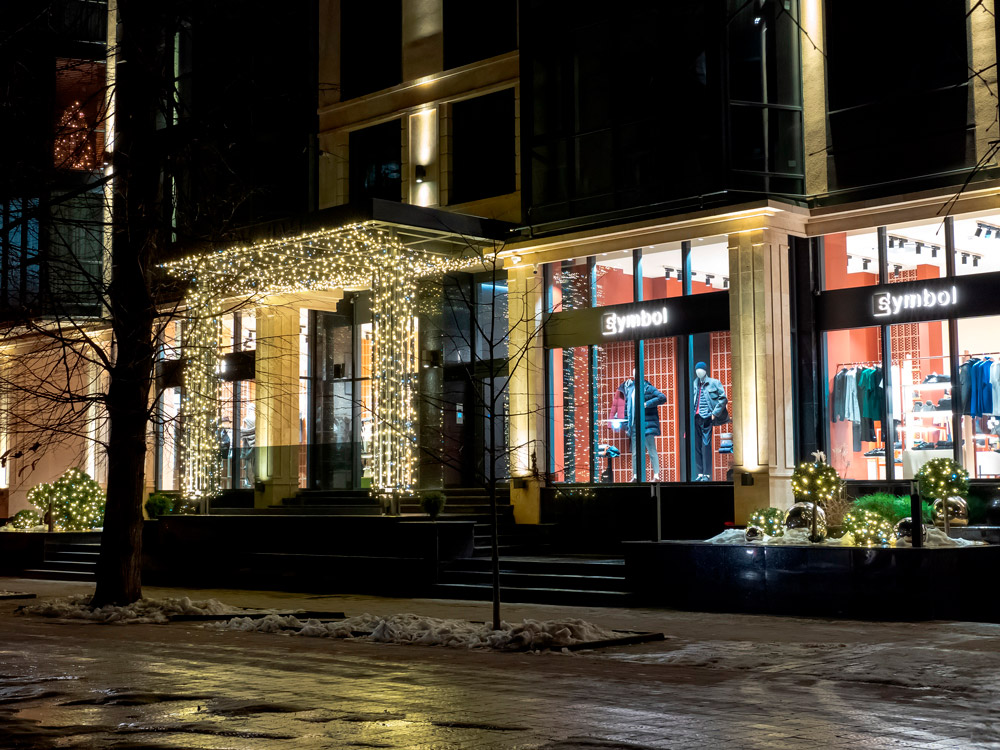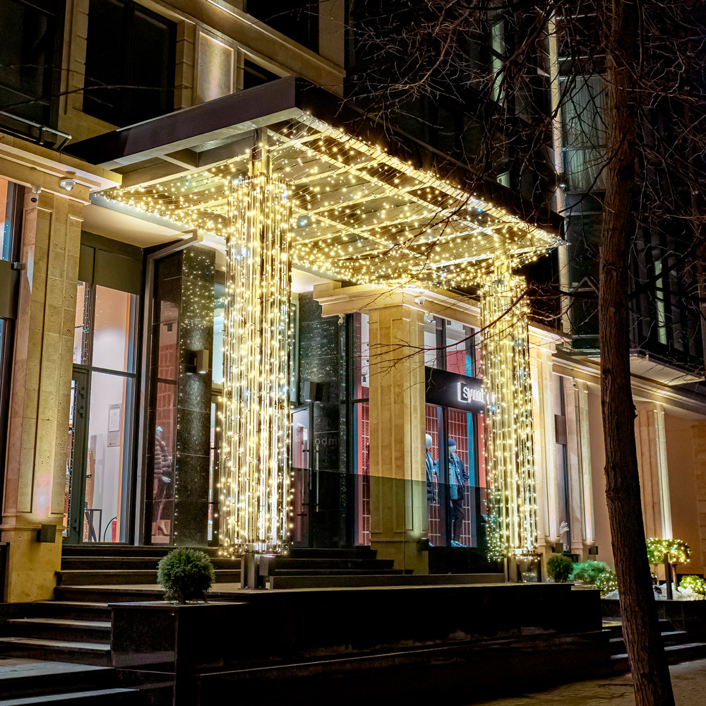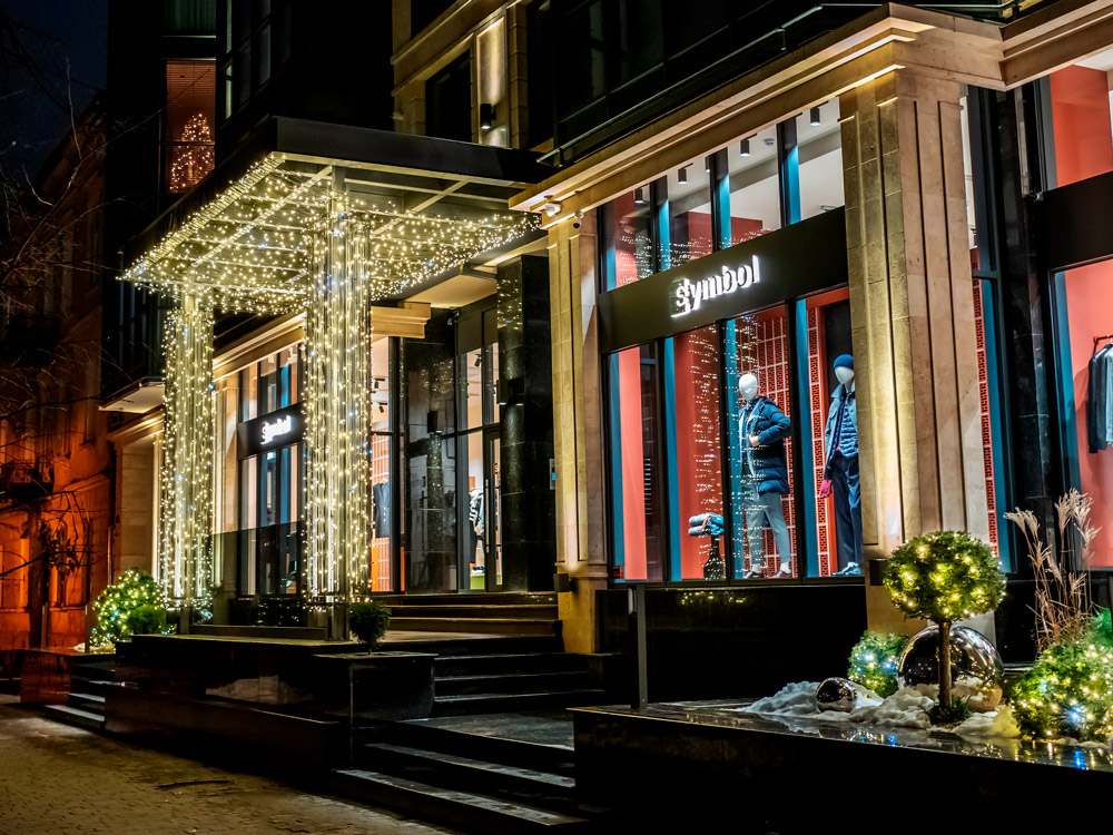 Новогоднее оформление фасада магазина Symbol в городе Ивано-Франковск, реализовано нашей компанией, выполнено в классическом стиле, используя гирлянды с мерцанием в золотистом цвете. Под козырьком входной группы расположено звездное небо, которое придает атмосфере элегантность и праздничный блеск. Колонны, украшенные световой цепочкой String Lite, сверкают теплом и изяществом.