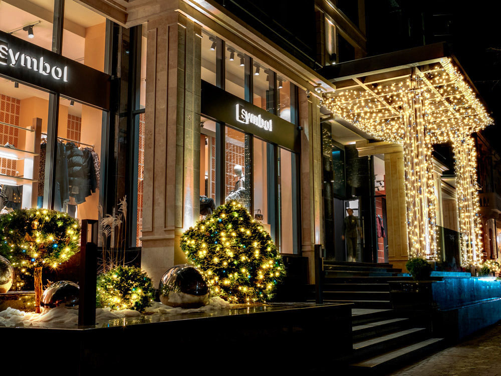 Это новогоднее оформление не только создает праздничное настроение, но подчеркивает эстетику и стиль магазина Symbol, придавая ему особый изысканный вид.