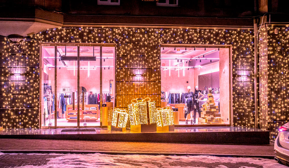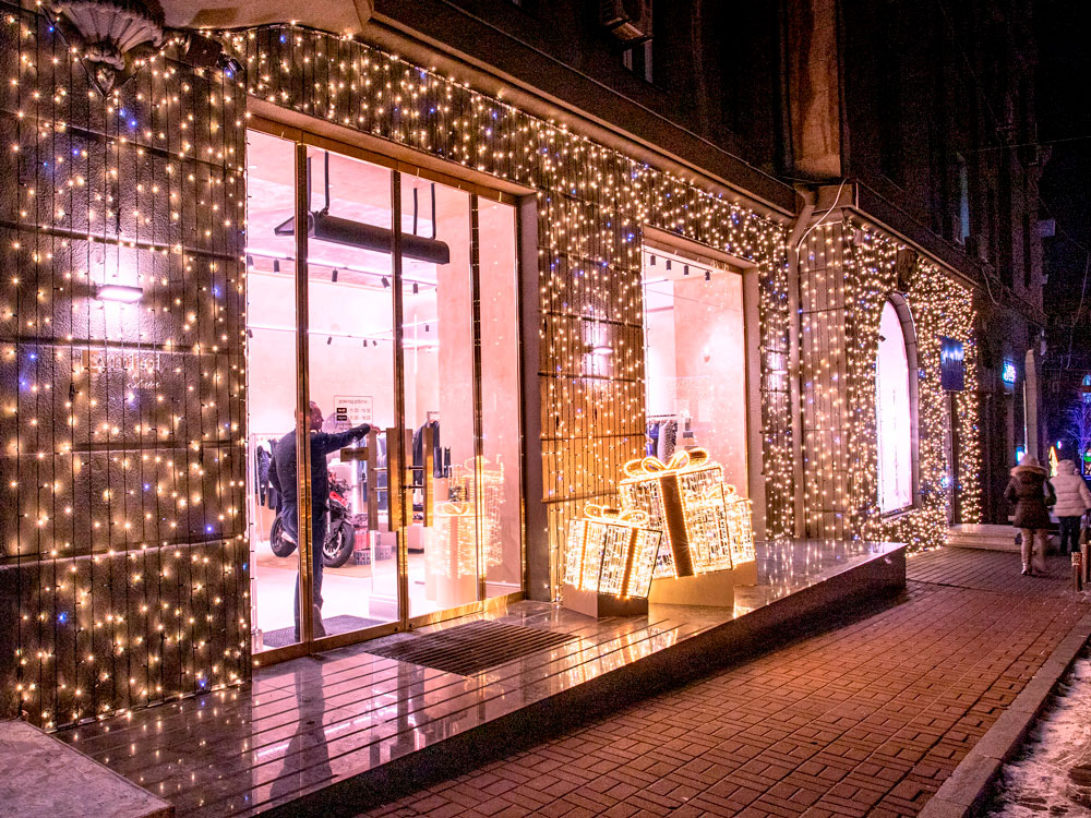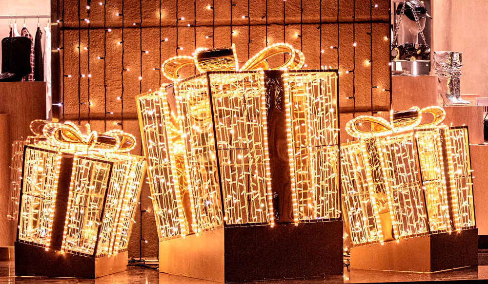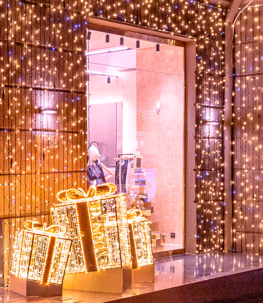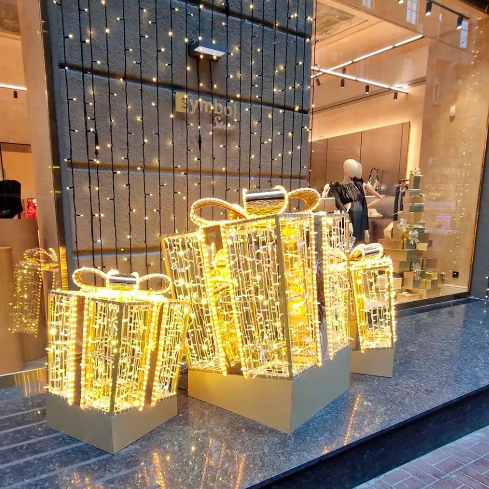 У фасада бутика расположены светодиодные декорации в виде подарков, дополняющих общий образ праздничной иллюминации. Эти декорации придают магазину особый шарм, доставляя радость как прохожим, так и покупателям во время рождественских праздников.