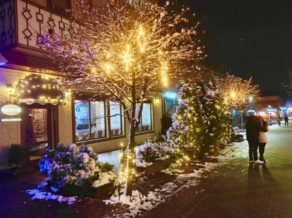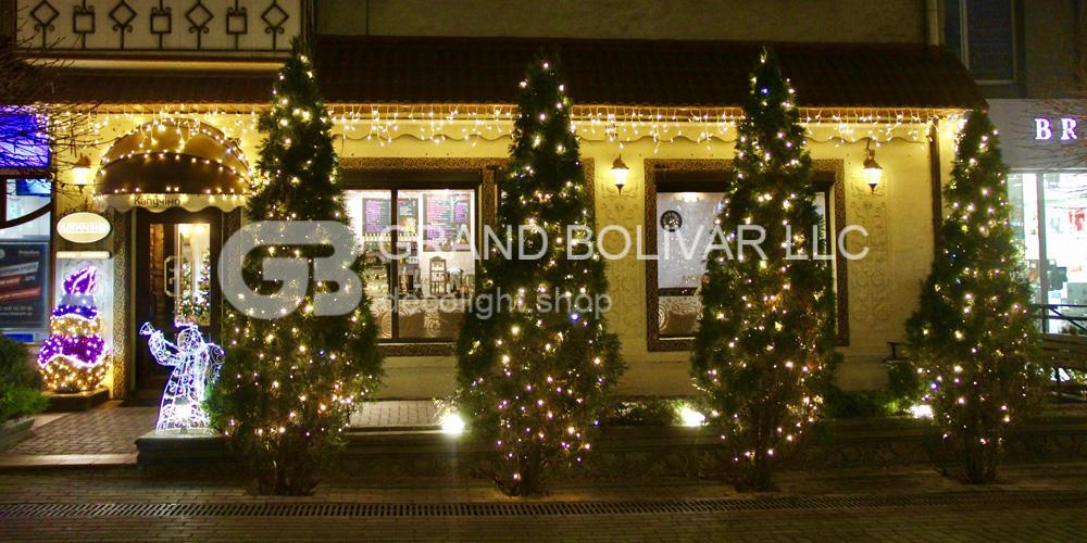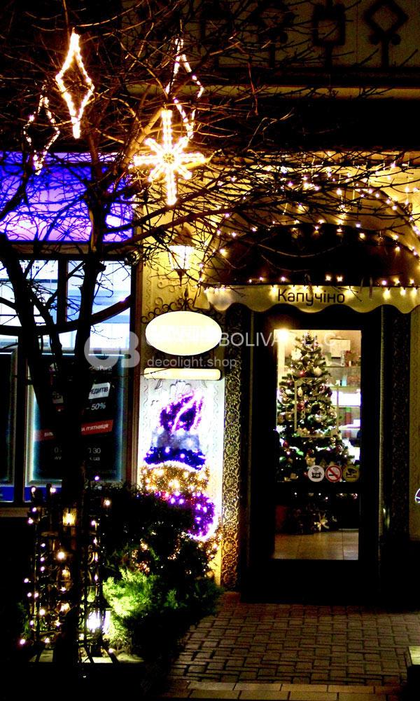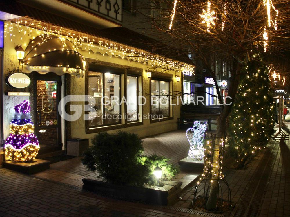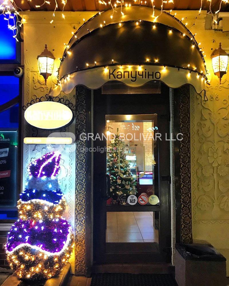 Новогоднее оформление кофейни & кондитерской Капучино г.Луцк — смотрится по-особенному празднично и атмосферно. Козырек входной группы украшен гирляндой DECOLIGHT, периметр фасада здания украшен светодиодными гирляндами ICELIGHT. Все гирлянды имеют теплый белый цвет и холодный мерцающий эффект, что создает уютную атмосферу заведения. В новогоднем оформлении фасадов все большую популярность получают дизайнерские эксклюзивные фигуры из мишуры и гирлянд. Конечно, же мы спроектировали и изготовили в нужных размерах светодиодную конструкцию в виде десерта и установили ее у входа в кафе. Туи, растущие вдоль аллеи, украшены светодиодными цепочками DECOLIGHT. Кроны деревьев украшены светодиодными мотивами, на ветках расположены звезды и искорки, стволы оформлены гирляндой DECOLIGHT. Теплое свечение светодиодных мотивов, которые излучают новогодние звездочки, и ненавязчивое мерцание гирлянд на деревьях и фасаде здания создают волшебную атмосферу любимого праздника. И так, мы получили, новогоднее оформление кофейни & кондитерской Капучино г.Луцк в традиционном европейском стиле для создания праздничного настроения и тёплой атмосферы.