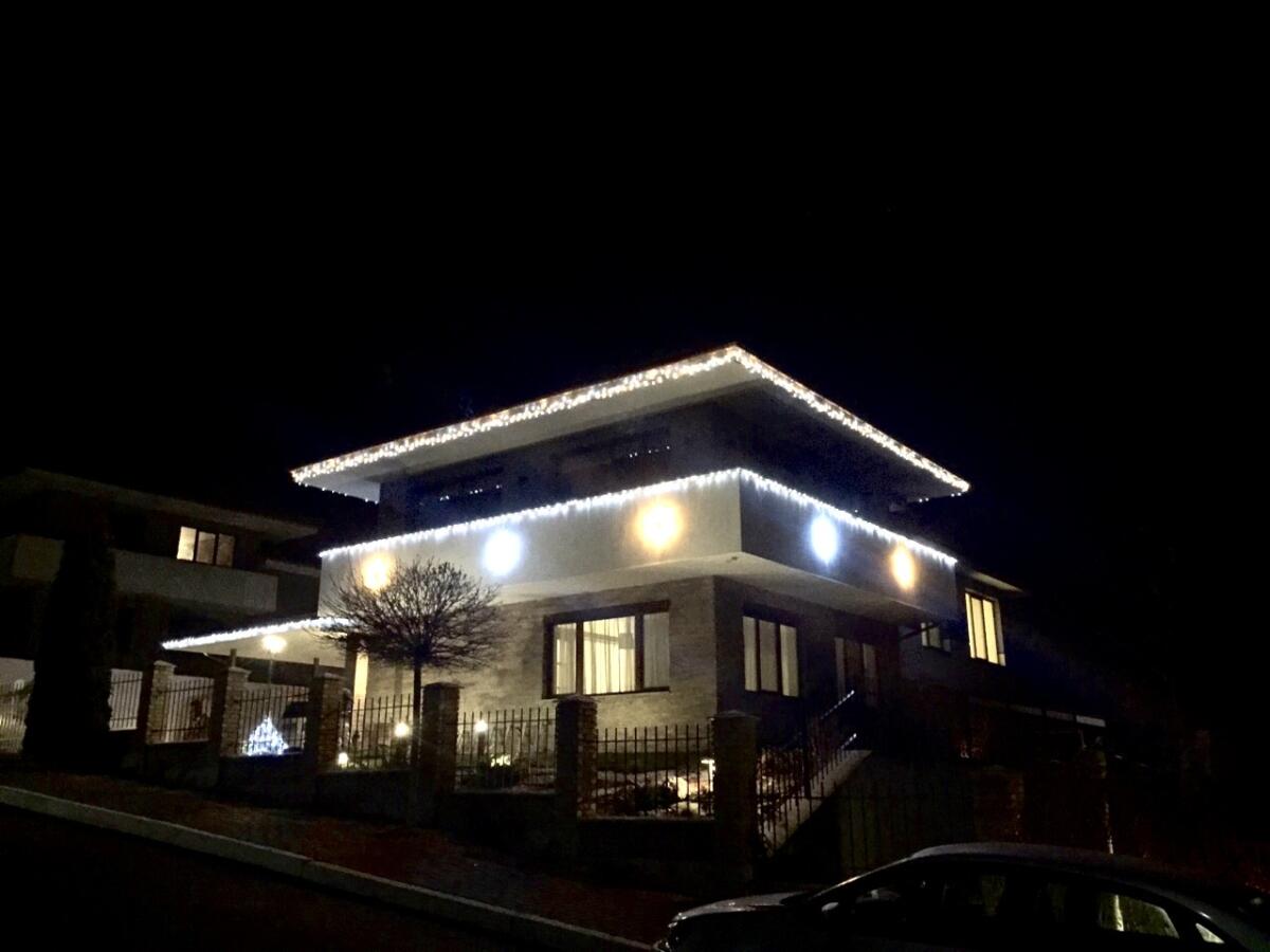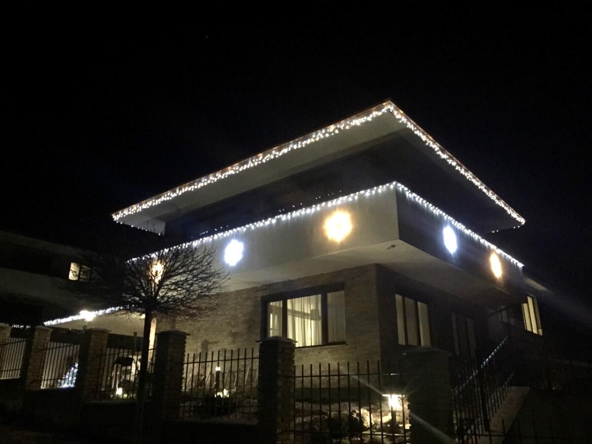 Новогоднее оформление коттеджа выполнено с помощью гирлянды String Lite двух цветов — теплого и холодного белого. На балконах разместили светодиодные снежинки также двух цветов. Сочетание этих цветов — это модный тренд последних нескольких лет в новогоднем оформлении.