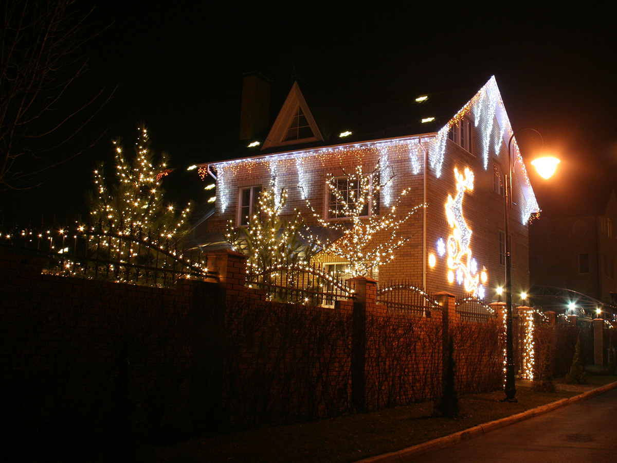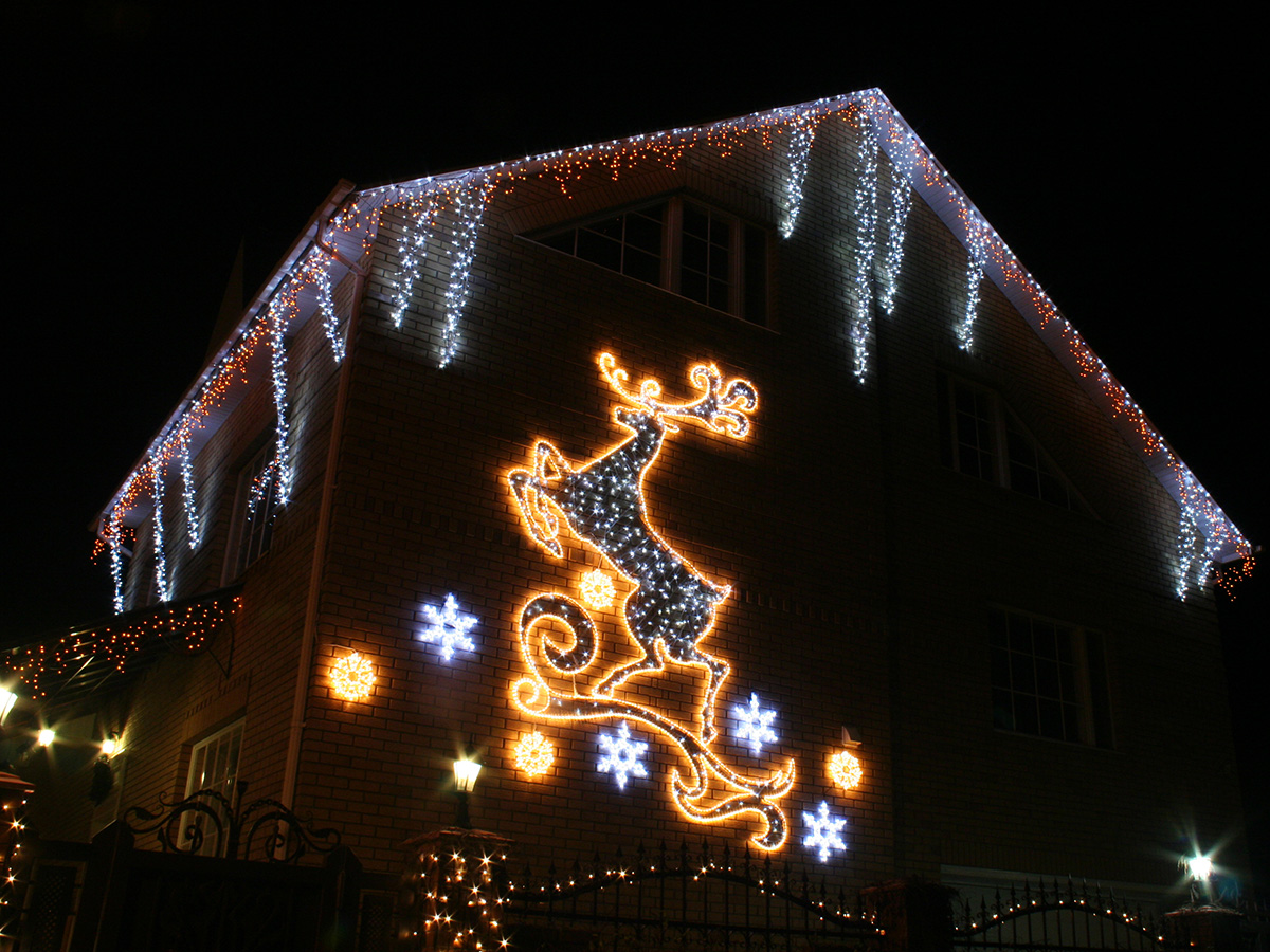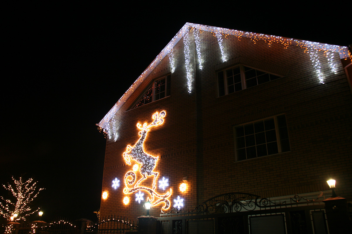 Новогоднее оформление коттеджа, уютные огни гирлянд во дворе, светодиодные композиции на фасаде – все это создает праздничное настроение