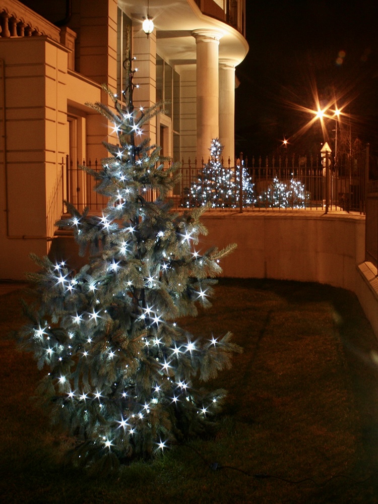 На территории ЖК Renaissance Residence высажено большое количество елей, которые нужно украсить к Рождественским праздникам. Для украшения елей использовалась гирлянда StringLite с флэш эффектом холодного белого цвета.