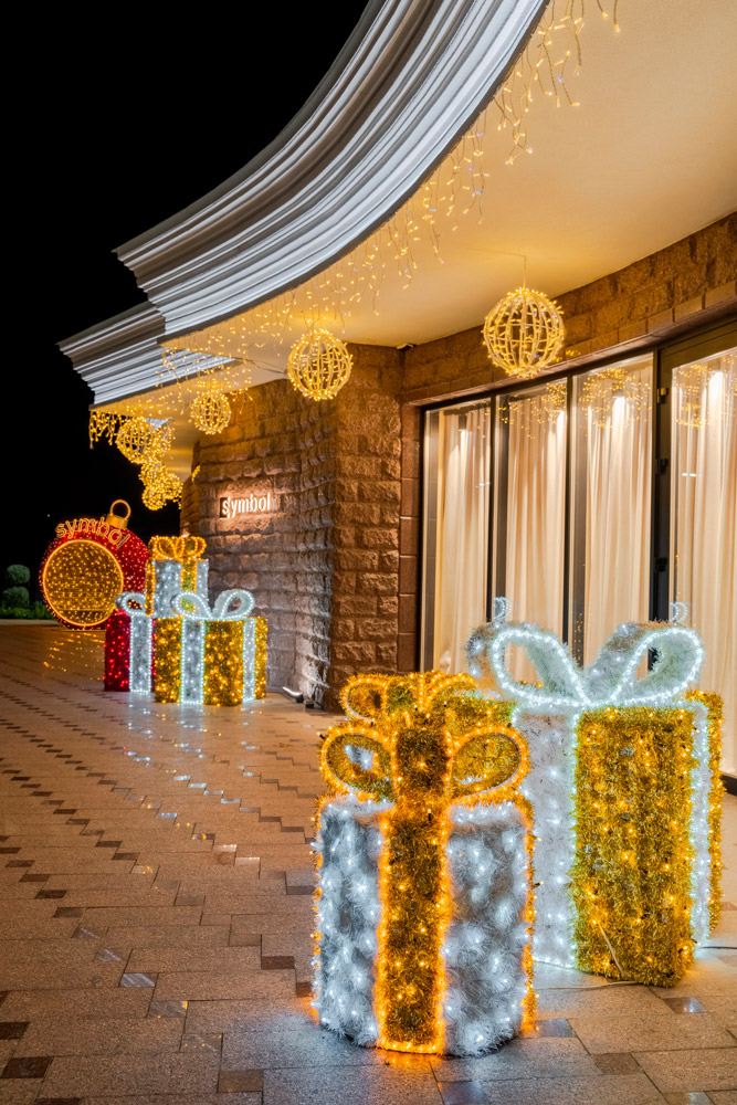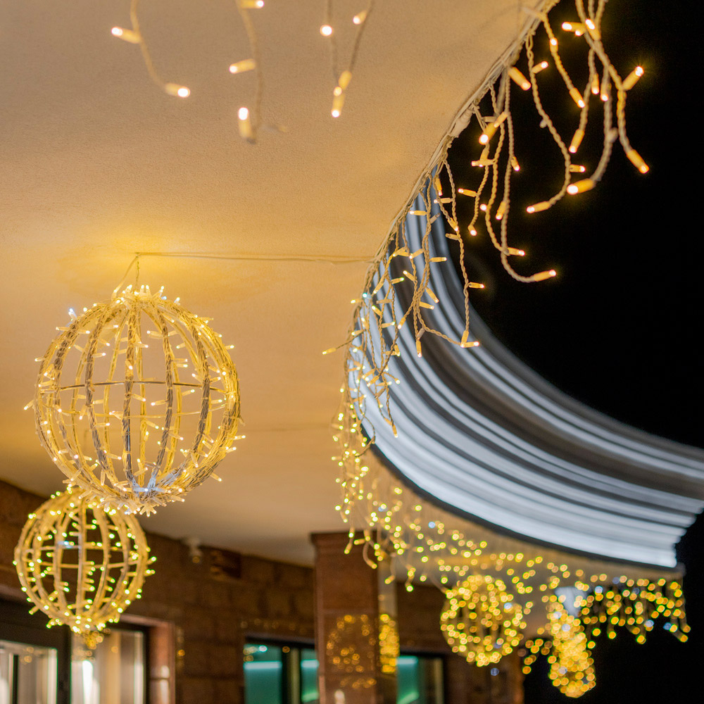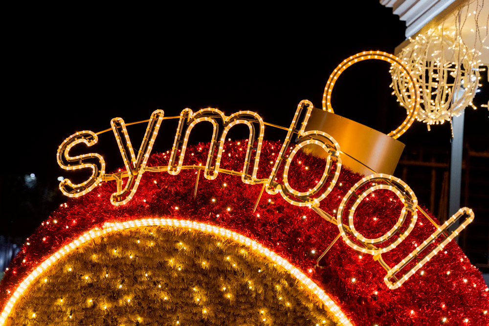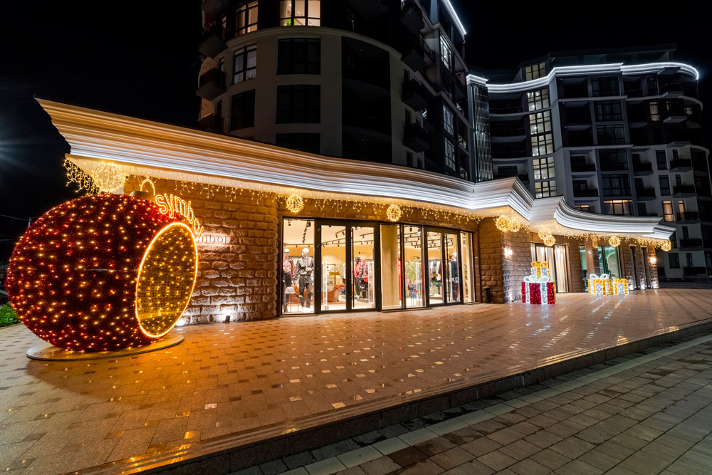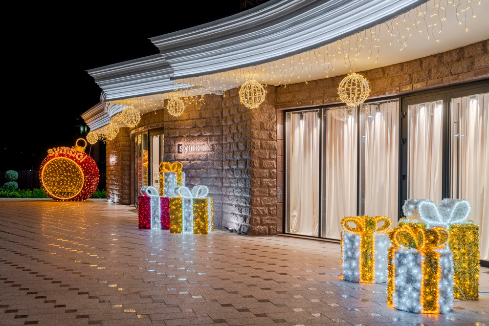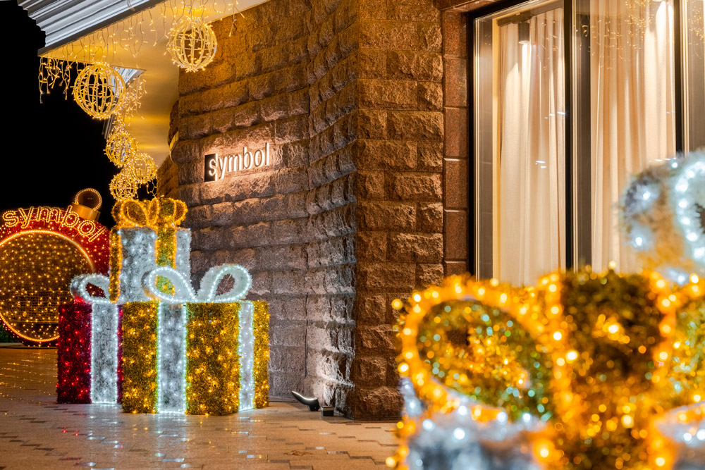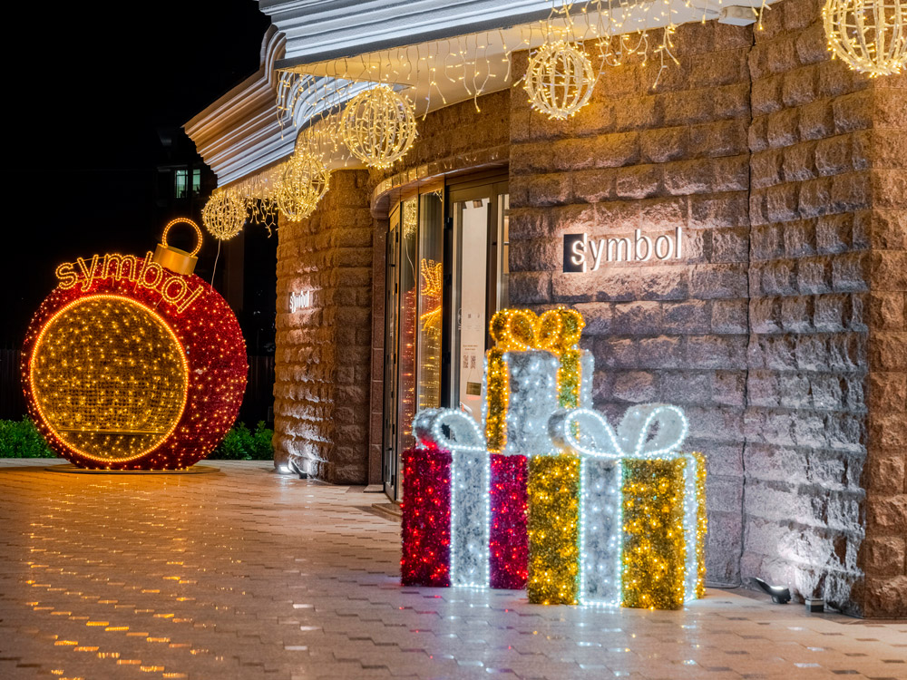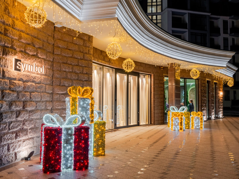 Праздничная иллюминация магазина Symbol удачно сочетает в себе светодиодные гирлянды LED ICELIGHT с мерцанием и световые сферы, создавая атмосферу радости и праздника. У фасада магазина установлены светодиодные фотозоны – большой новогодний шар с логотипом магазина и декорации в форме подарков.