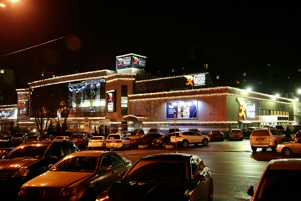 В праздничной иллюминации фасада магазина GOOD WINE использовали яркие светодиодные гирлянды торговой марки MK-Illumination.