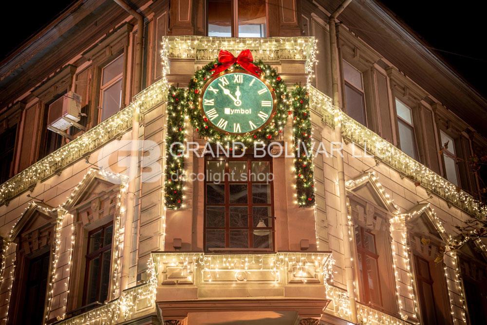 Красоту здания подчеркивают контуры из световых цепочек LED DECOLIGHT по всем окнам и колонам фасада. Фигурный занавес LED ICELIGHT элегантно подчеркивает архитектурные элементы на фасаде здания. Изюминкой в оформление фасада стали световые часы над главным входом. Часы украшены хвойной гирляндой из литых веточек ели, гирлянд, красных бантов и елочных игрушек. Такой новогодний декор на фасаде смотрятся изумительно.