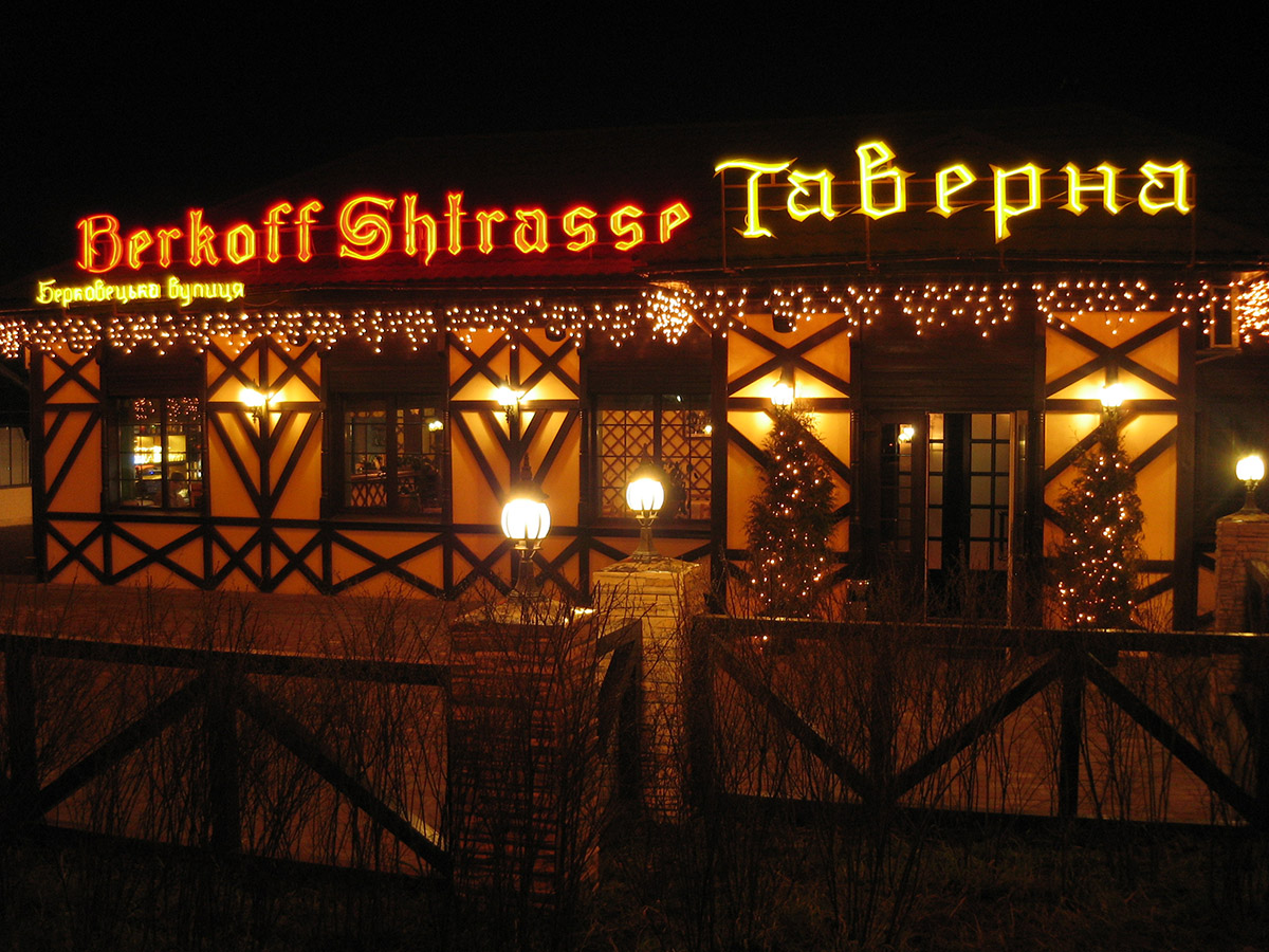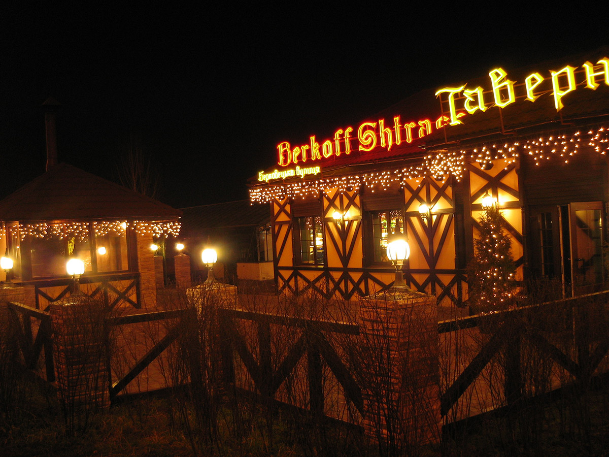 Праздничная иллюминация ресторана Беркофф Штрассе гармонично смотрится на протяжении всего года, создает теплую и уютную обстановку посетителям заведения. Получилось по-домашнему – тепло и уютно.
