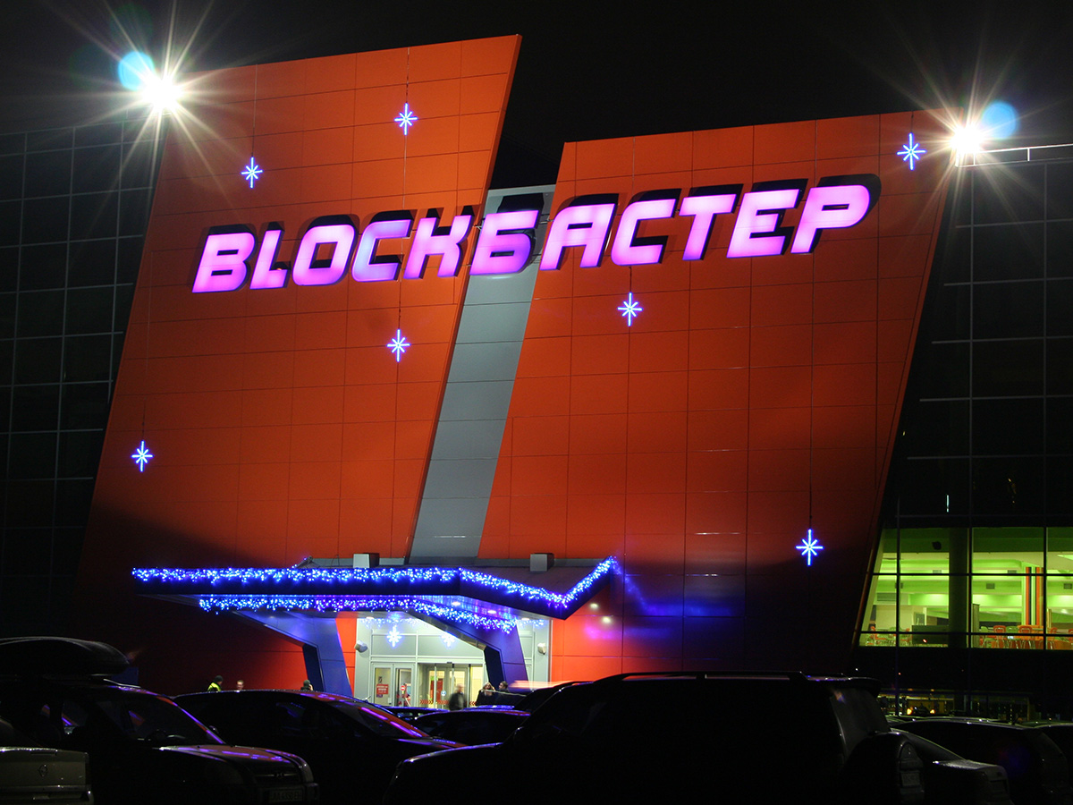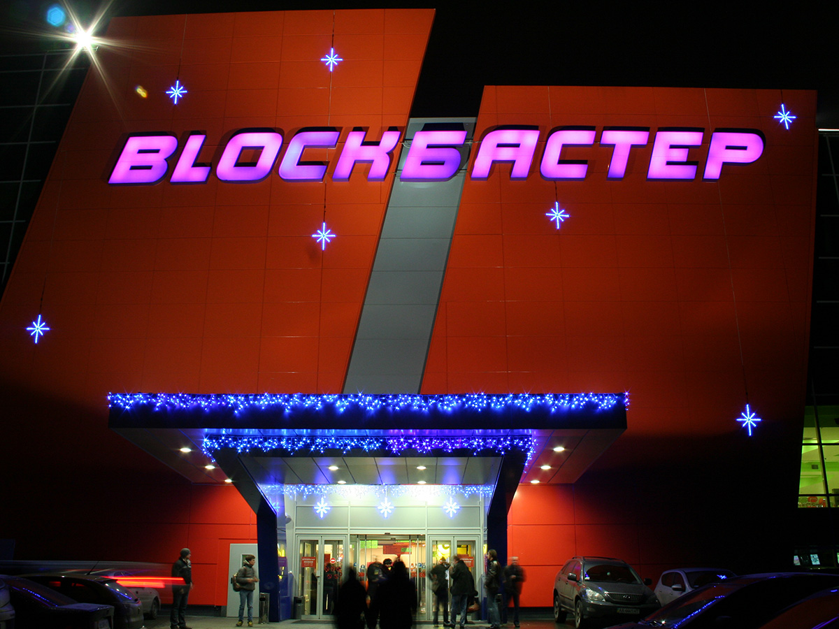 Перед нами стояла задача придумать новогоднее оформление фасада ТРЦ с небольшим, очень ограниченным бюджетом, при этом украсить нужно было входную группу и два фасада. Праздничная иллюминация ТРЦ Блокбастер выполнена в синих цветах, этот цвет хотел заказчик.  Для оформления входной группы использовали гирлянды LED Ice Lite и световые мотивы Polaris 50см.  Фасад торгового центра украшен крупными светодиодными звездами Polaris, которые хаотично были разбросаны по фасаду. На нижнем и вернем ярусе ТРЦ со стороны проезжей части установили светодиодные шторы LED Drape Lite.