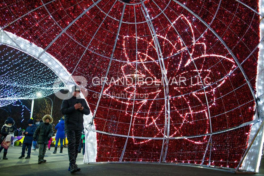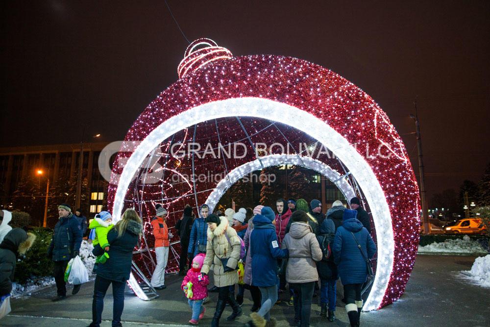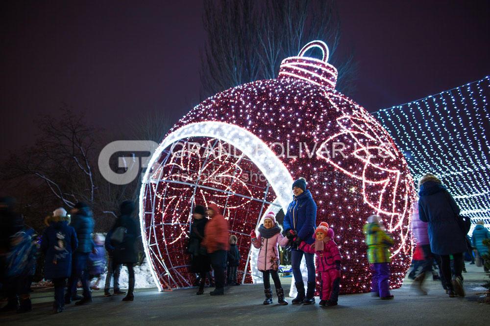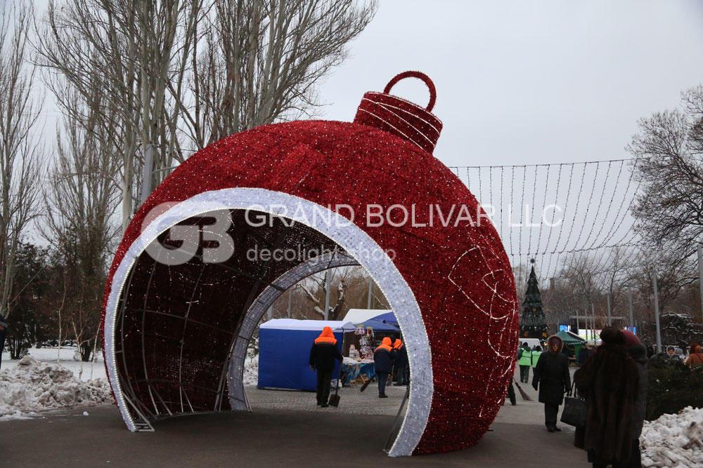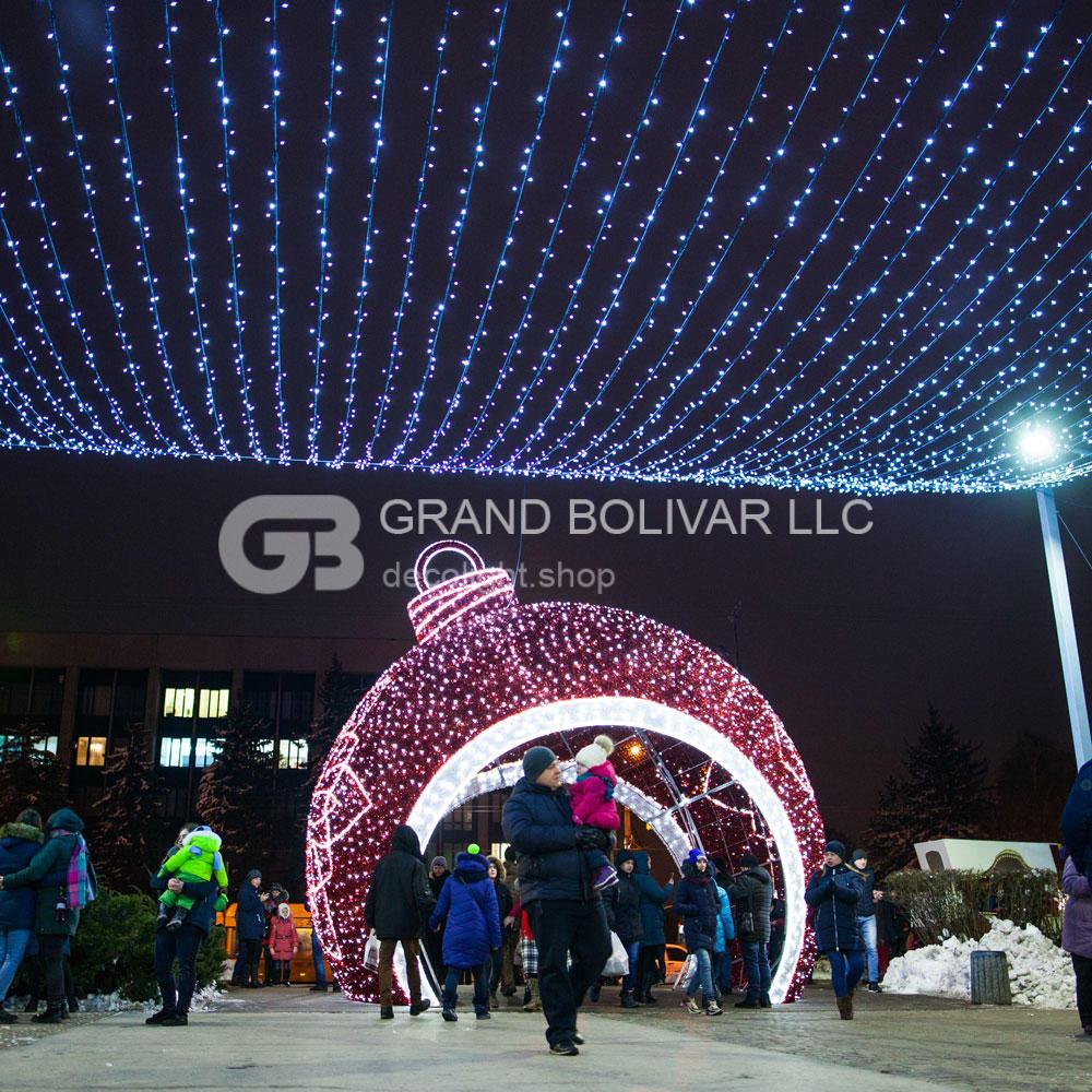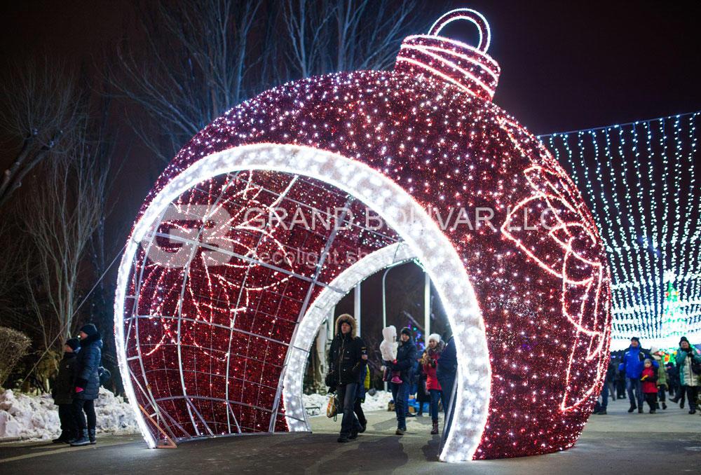 Самый большой светодиодный елочный шар сделан из алюминиевого каркаса, украшен светодиодными гирляндами и елочной мишурой. Он представляет из себя светящуюся объемную арку в форме усеченной сферы с возможностью сквозного беспрепятственного прохода.