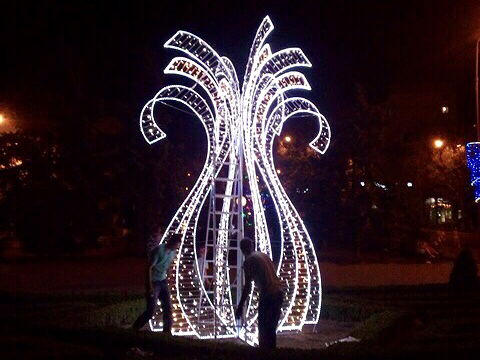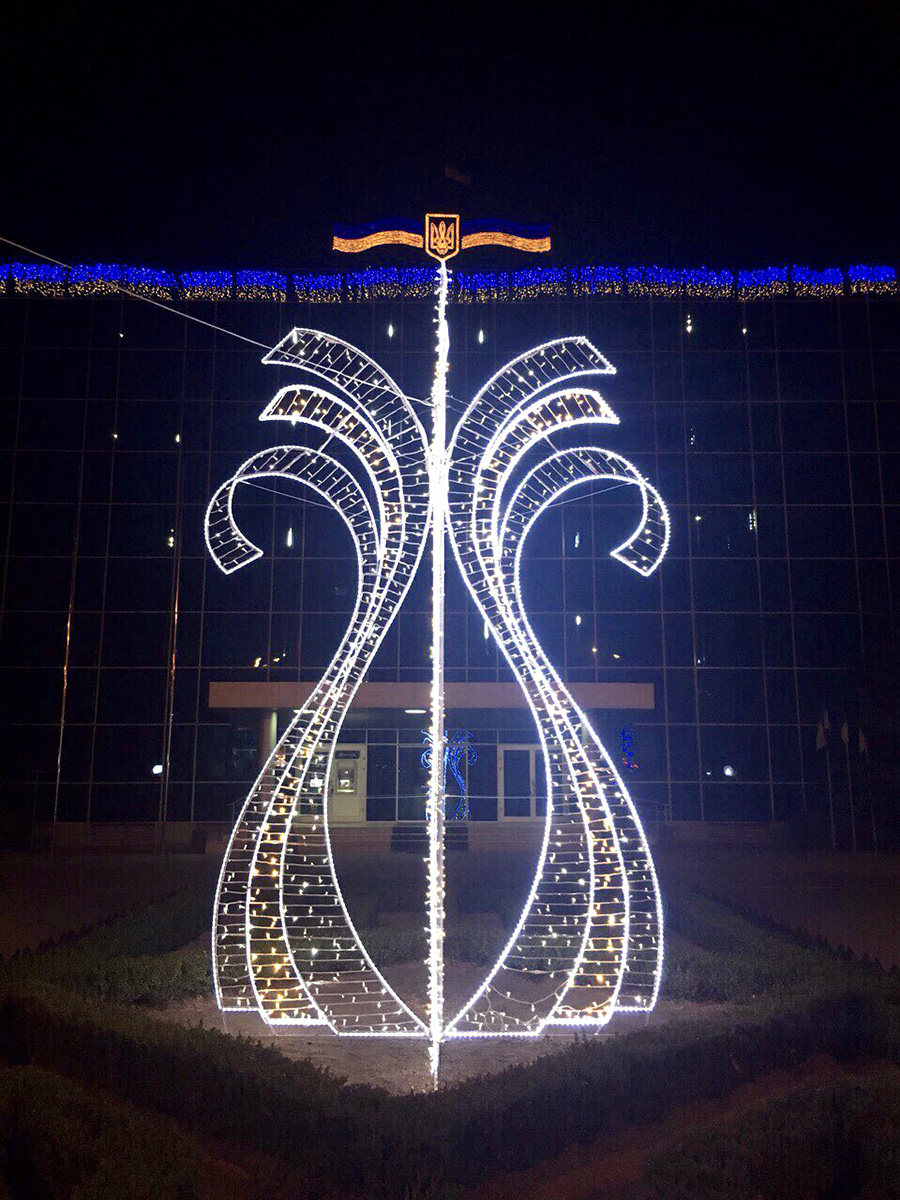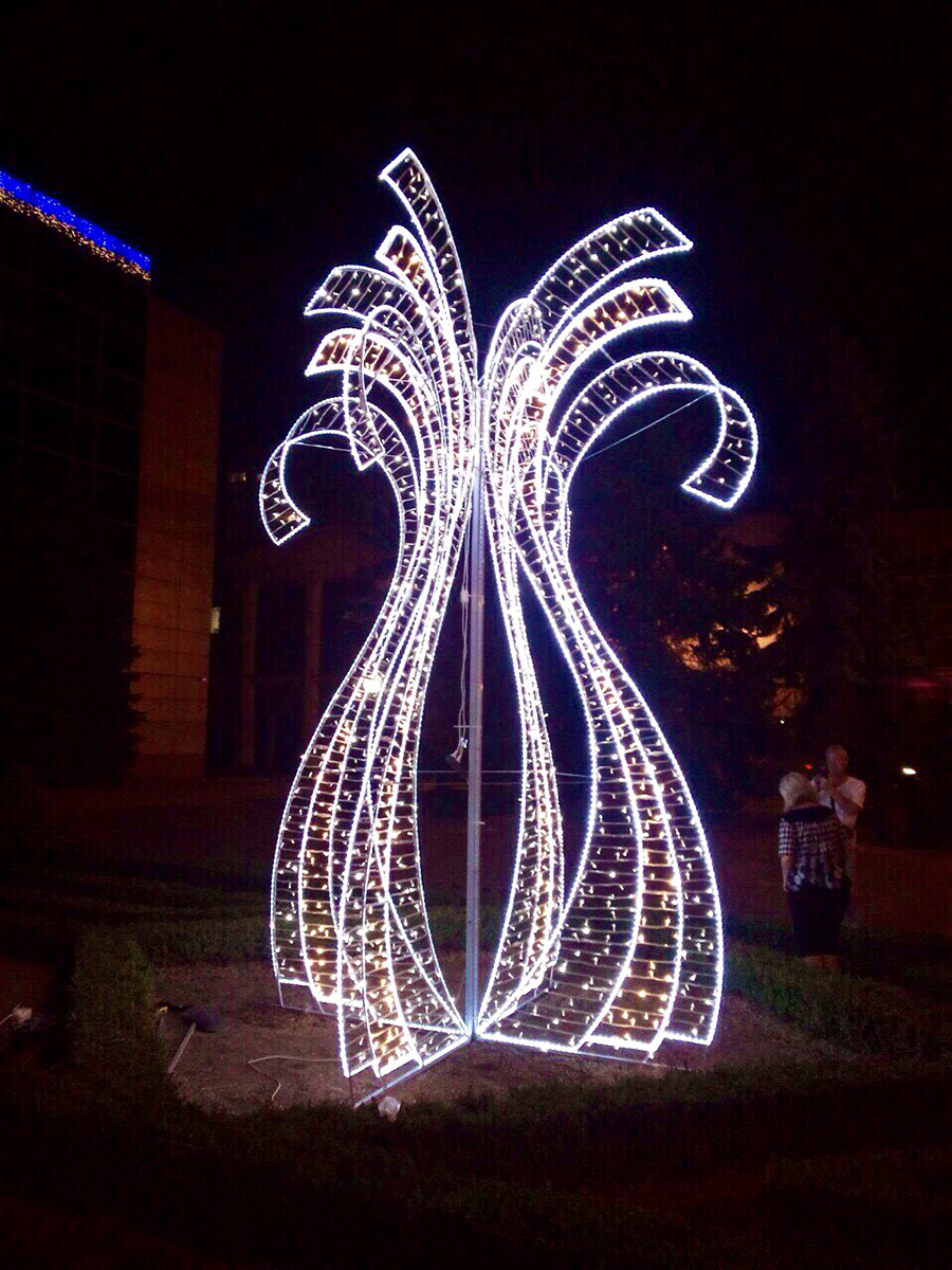 Светодиодный фонтан был изготовлен и установлен ко Дню Независимости в г.Черноморск. Фонтан изготовлен из алюминиевого каркаса, светодиодного шнура Rope Lite и световой цепочки String Lite. Гирлянды работают в любую погоду, не боятся морозов и осадков, имеют степень защиты IP44. Детали проекта Год реализации 2016 Автор проекта ООО Гранд Боливар Производство декораций 4 дня Монтаж оборудования [...]