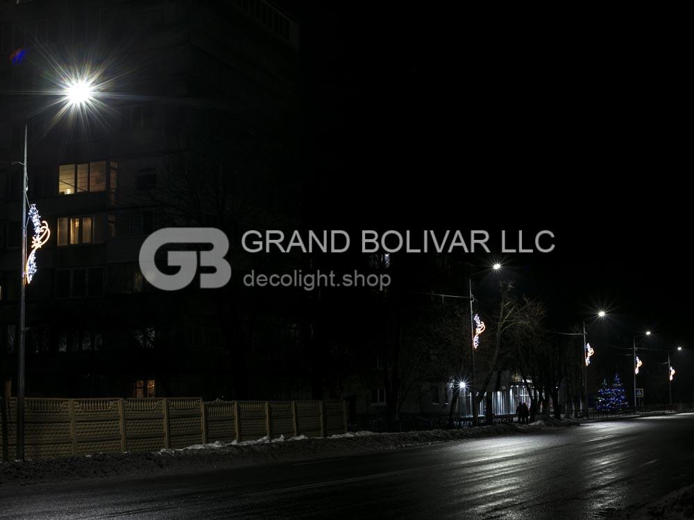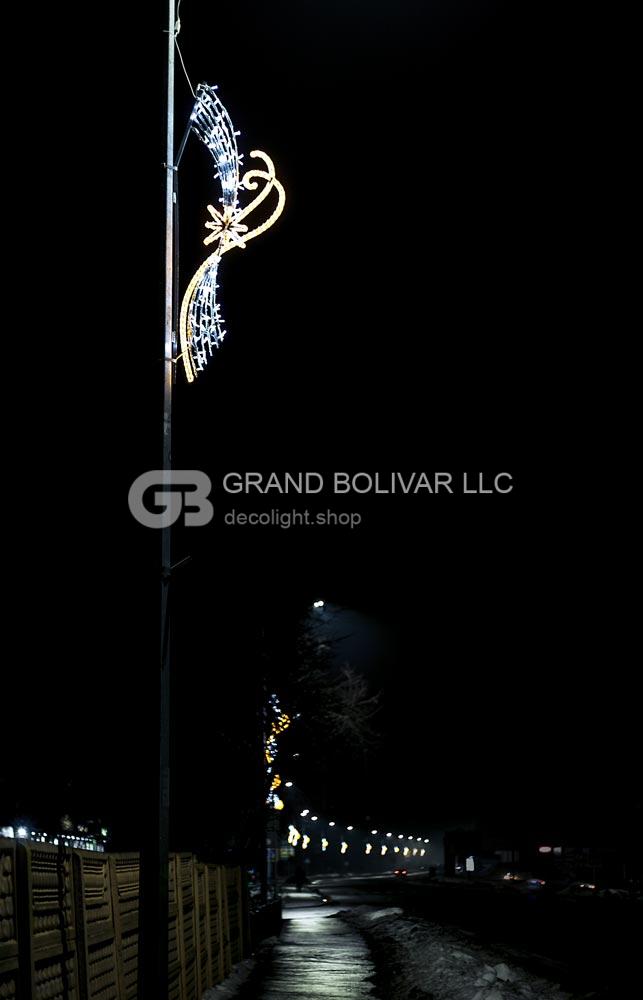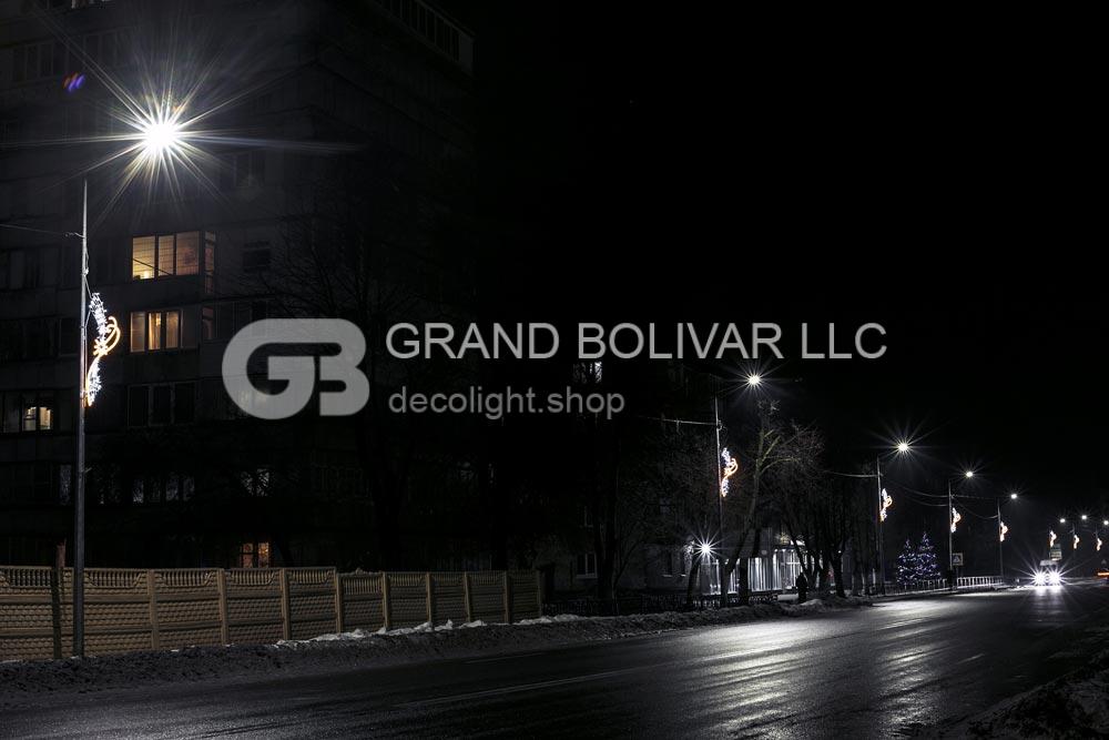 Световые консоли украсили опоры на центральной улице поселка Чабаны в канун новогодних праздников. Изящные и нежные декорации смотрятся празднично и изыскано. Светодиодные консоли изготовлены из легкого алюминиевого каркаса с применением светодиодных гирлянд LED DECOLIGHT и дюралайта LED Ropelight. Стилистика данной светодиодной консоли позволяет использовать их не только в канун новогодних праздников, но и круглогодично.