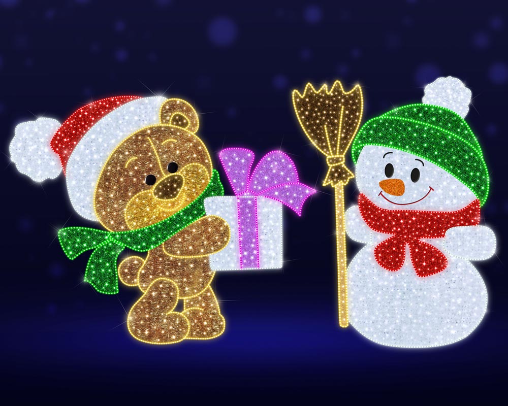 Світлодіодна фотозона “Сніговик” виготовлена з алюмінієвого каркасу, світлодіодних ланцюжків, дюралайту та з вогнестійкої металізованої мішури.
