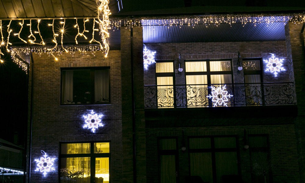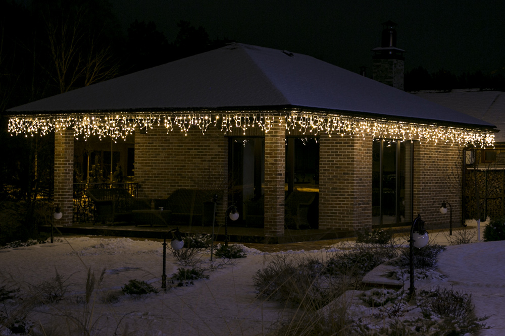 Вулична гірлянда бахрома теплий білий ICELIGHT підходить для оформлення фасадів, дахів, арок і терас, створюючи класичну новорічну атмосферу. Тепле біле світіння створює атмосферу затишку, вона органічно поєднується з іншими моделями, зокрема String Light та Curtain Light. Завдяки універсальному дизайну цю модель часто використовують у святковому оформленні ресторанів, торгових центрів та приватних садиб.